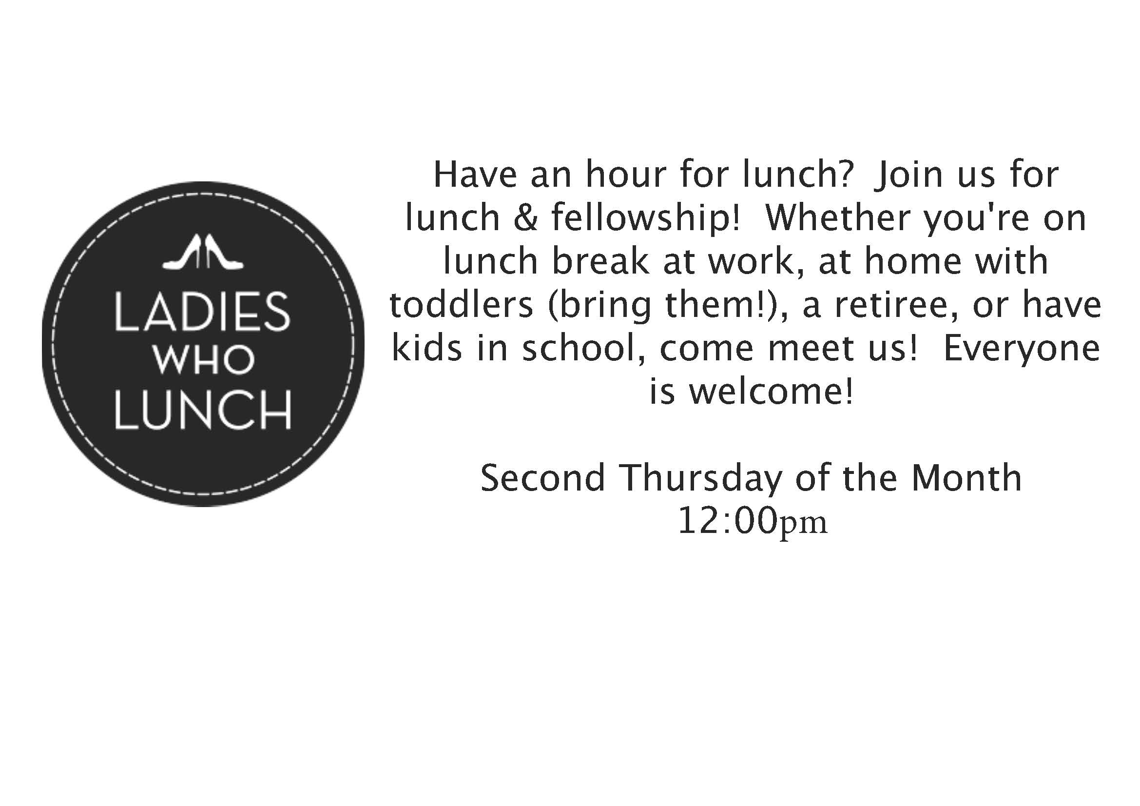 Ladies Who Lunch will meet at Simply Delicious on Thursday, March 12th, at 12:00 pm. Have toddlers? Bring them! Retired? Work but have an hour for lunch? Join us! Everyone is welcome!